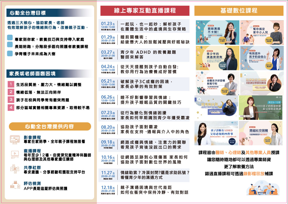 二、本方案課程由兒童心智科醫師、臨床心理師、職能治療師 等專家群共同規劃數位影音課程、專家直播課程等,詳如 附件。
