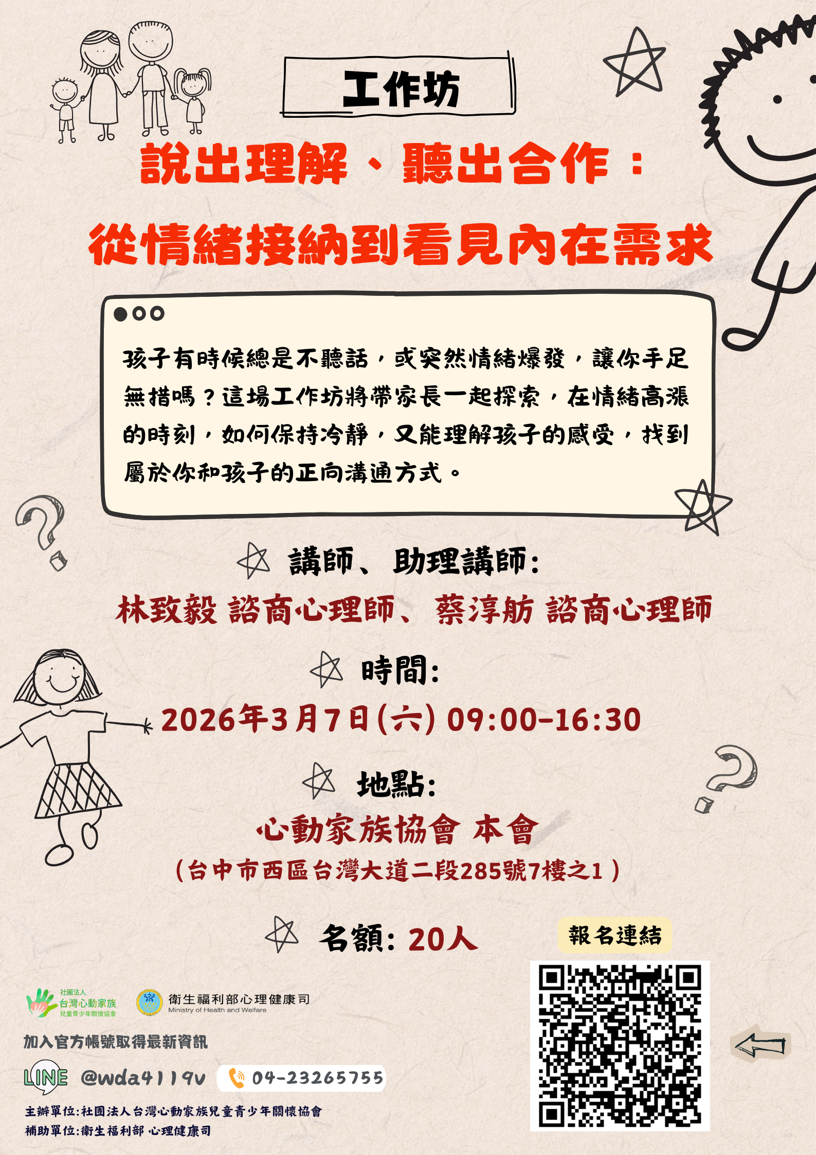 (一)03/07(六)【實務體驗工作坊】 主題:說出理解、聽出合作:從情緒接納到看見內在需求 講師:林致毅 諮商心理師、蔡淳舫 諮商心理師 時間:09:00-16:30 地點:心動家族協會 本會(台中市西區台灣大道二段285號7樓 之1)