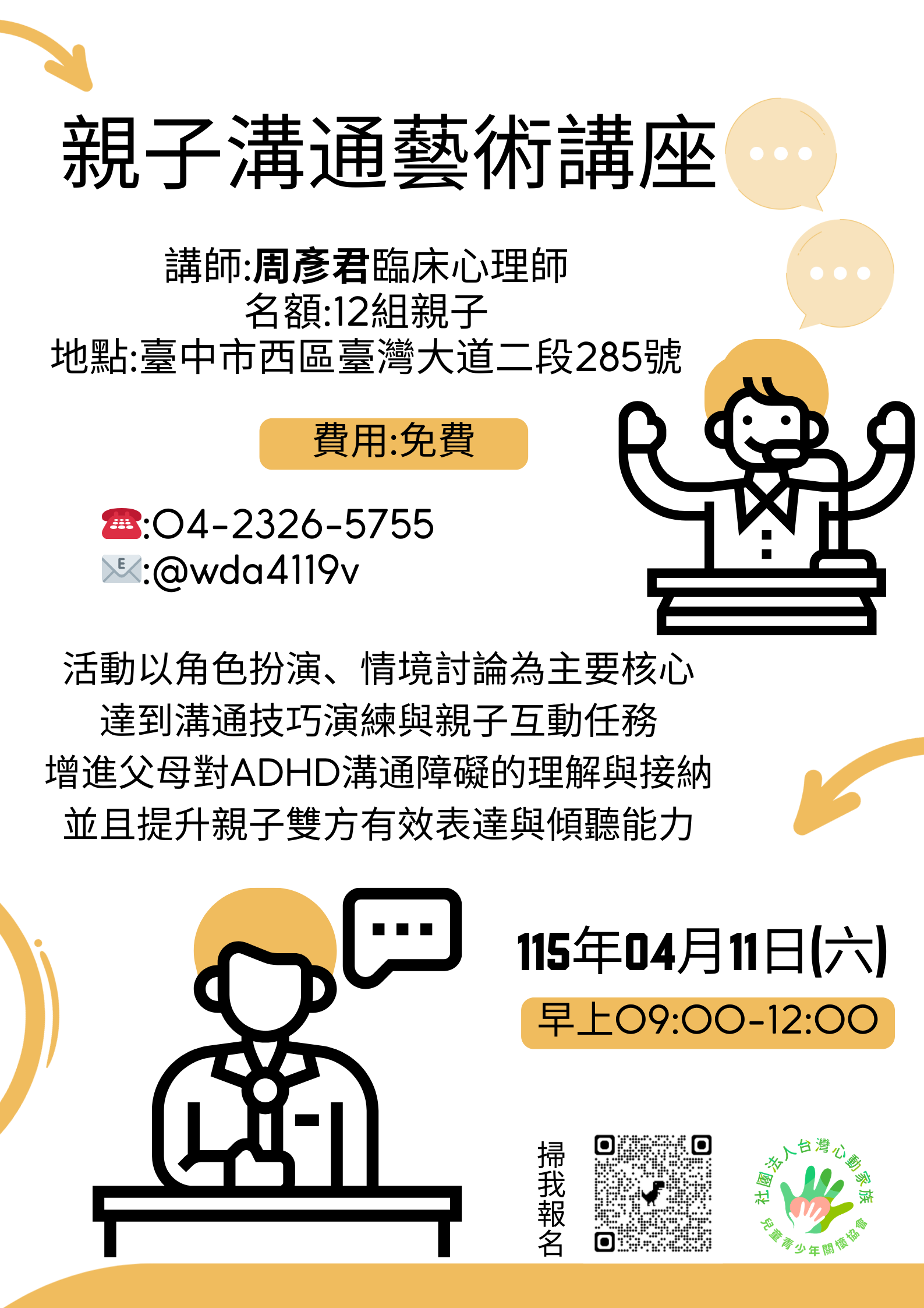 (一)04/11(六)【親子溝通藝術講座】 講師:周彥君 臨床心理師 時間:09:00-12:00 地點:心動家族協會 本會(台中市西區台灣大道二段285號7樓 之1) 名額與對象:12組親子